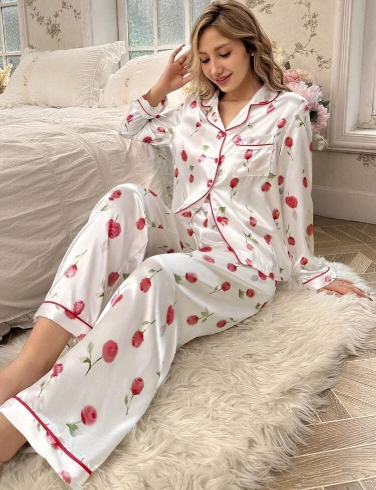 CottageSlumber Ink Floral Print Collared Long Sleeve Top & Trousers Set Pajamas Set For Womanwomen Pajama Setswomen Pajama