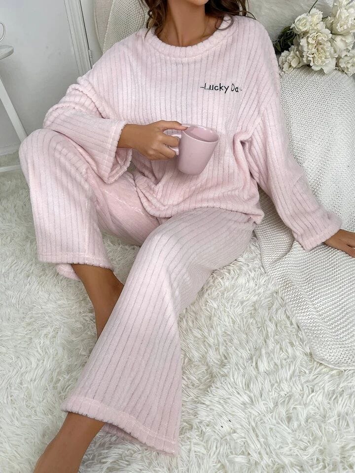 Shein Coupled Up Letter Embroidery Drop Shoulder Flannel Lounge Set