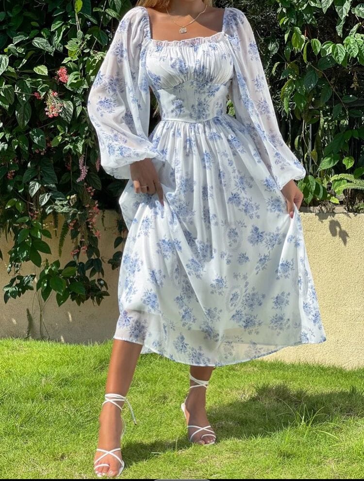 SHEIN Holidaya Allover Floral Print Lantern Sleeve Ruched Bust Chiffon Dress Maxi Vacation Beach Outfits Women • Color: White